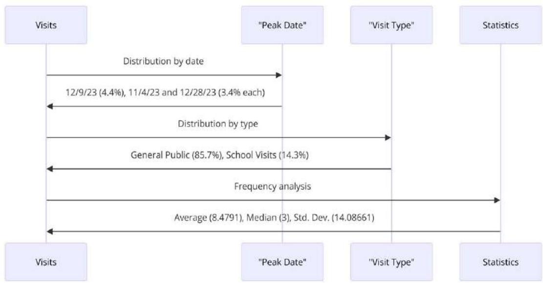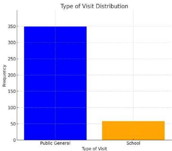 This study analyzes the distribution and characteristics of visits to certain sites, highlighting significant variations in the number of visitors by date, with December 9, 2023, recording the highest influx $(4.4\%)$. The visits are predominantly classified as "General Public" $(85.7\%)$, while "School" visits constitute $14.3\%$. There is a predominance of small groups, with $36.9\%$ of visits consisting of two people, though records of exceptionally large groups (90 or 98 visitors) are attributable to specific organizations.
