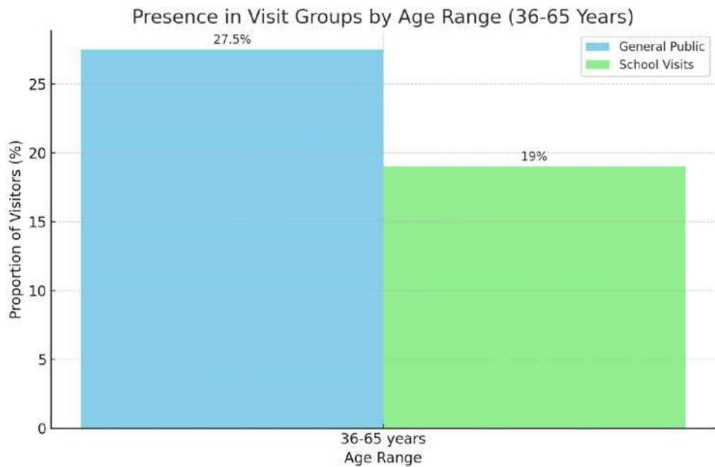 Figure 19: Stacked bar chart to provide a visualization of the distribution of visitors by age range within groups, distinguishing between general public visits and school visits.