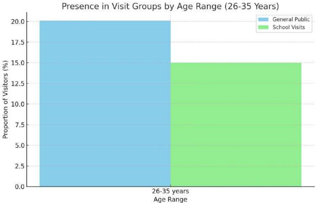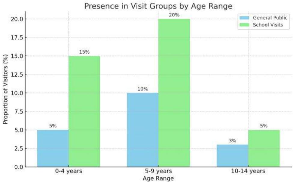Figure 17: Stacked bar chart to provide a visualization of the distribution of visitors by age range within groups, distinguishing between general public visits and school visits.