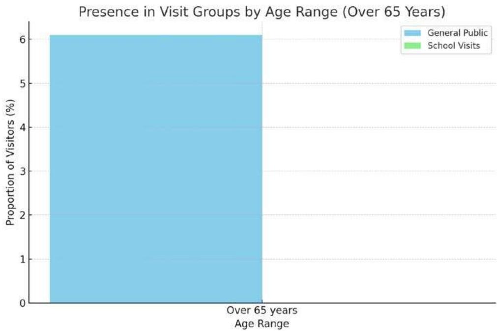 $93.9\%$ of visits exclude individuals over 65 years old, suggesting possible perceptions of inaccessibility or disinterest in this age group. Participation from this segment is marginal, with a minority of groups including 1 or 2 older visitors. The lack of correlation between the total number of visitors and age (Tau-b and Rho: 0.000) demonstrates that the presence of visitors over 65 does not significantly affect the size of the group.