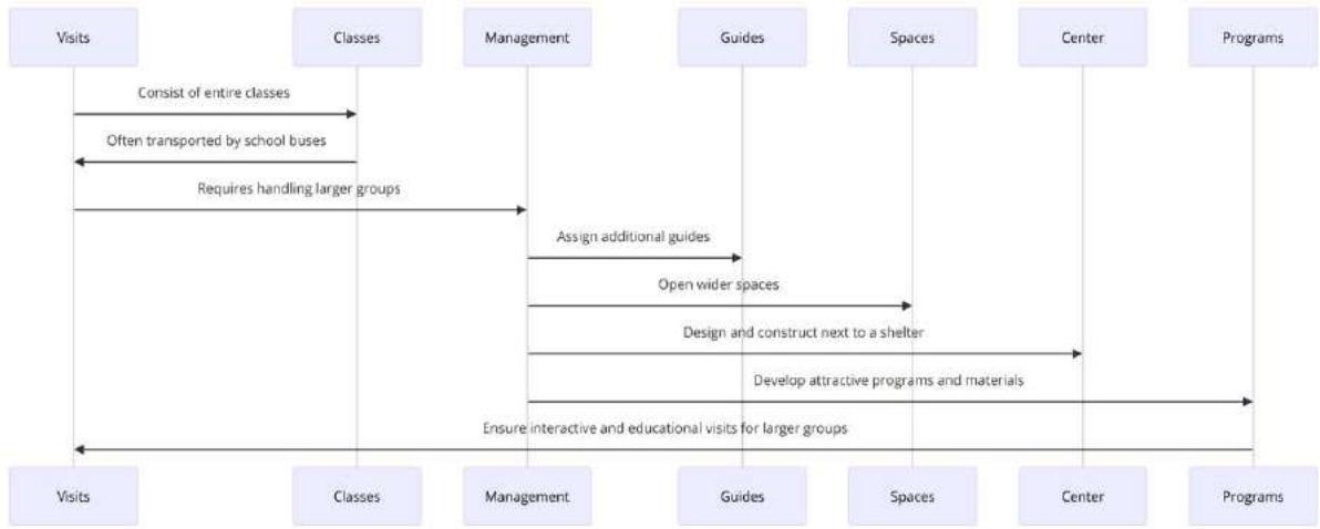 The prevalence of larger groups in school visits (Type 2) highlights the tendency of these visits to include entire classes, usually transported by school buses, which increases the number of visitors per group. In response, the management of the shelters has implemented strategies to efficiently handle the high influx of school groups, such as assigning additional guides and opening wider spaces. Specifically, the War Interpretation Center in Alicante was constructed next to the Sénéca Square shelter to facilitate educational and interactive visits for large groups. This strategic approach has also guided the development of programs and educational materials designed to attract and effectively manage the volume and dynamics of large school groups, as evidenced in the visualization of the sequence diagram (Figure 10), which illustrates the flow from identifying the needs of school visits to the implementation of tailored solutions.