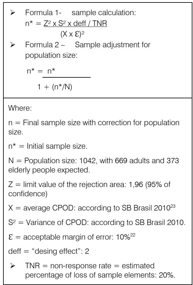 To determine the minimum sample required for the study, a stratified random sampling was obtained and partitioned into two age groups: adults and the elderly. The calculation to obtain the minimum sample was based on a population mean (DMFT for populations between 35-44 and 65-74 years in the interior of Southeastern Brazil), used as a reference for the adult and elderly groups by the WHO $^{21}$ and obtained in the last national oral health survey $^{22}$. The formulas used are shown in Chart 1 and follow the standards applied in the SB BRASIL study $2010^{23}$.