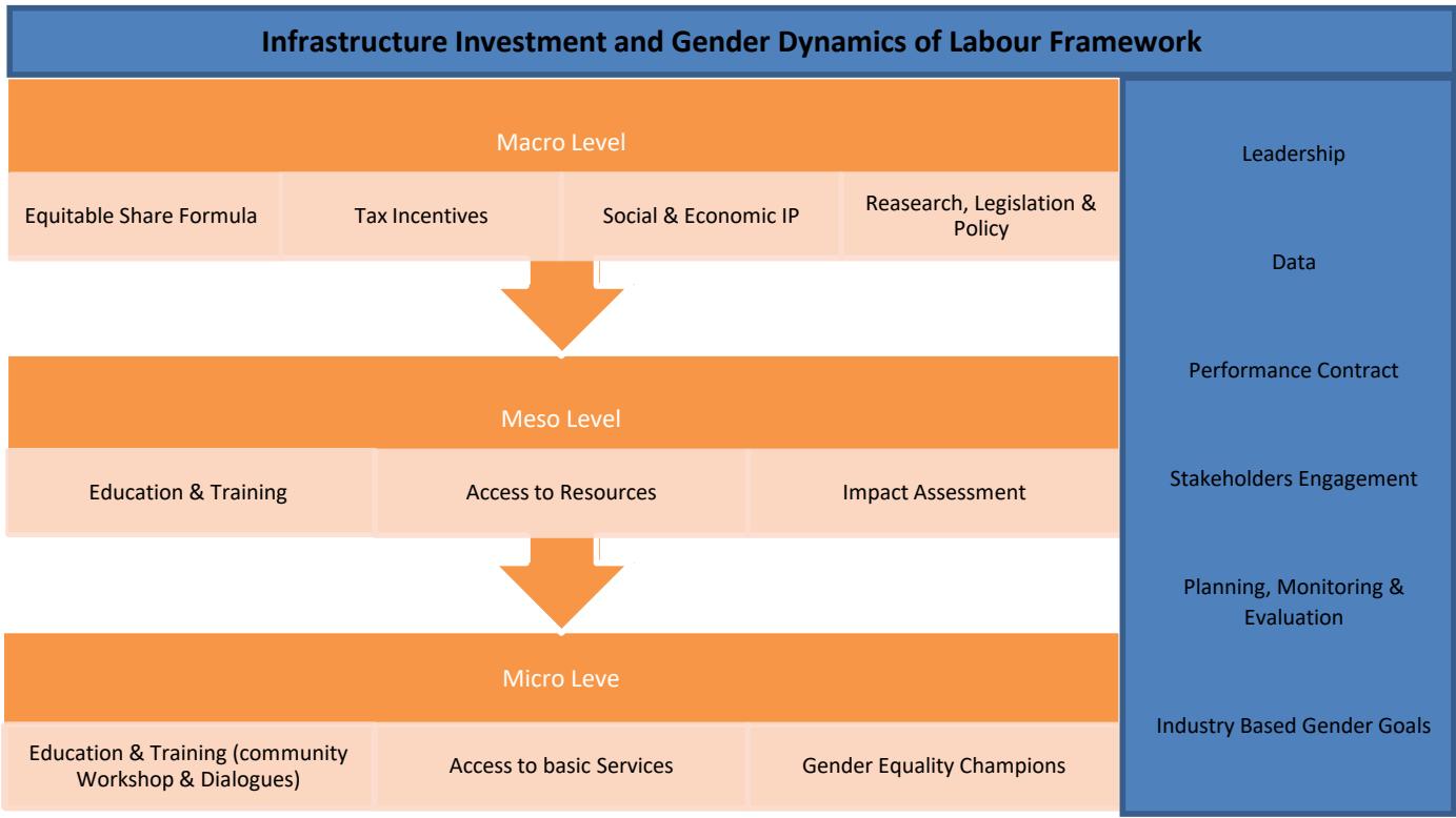 Effective and efficient conceptualisation and implementation of infrastructure investment is fundamental to every country’s development. Many studies over decades have presented scientific evidence to this effect and it can be narrowly disputed. However, very few studies have been under-taken to point out the development inter-link of infrastructure investment and gender equality. What if further lacking, is the systems, tools and applicable frameworks which can provide scientifically based evident planning to ensure gender mainstreaming in infrastructure investment. Therefore, this paper proposes an Infrastructure Investment and Gender Dynamics of Labour Framework. The framework proposes factors to consider during the conceptualisation and implementation of infrastructure investment at macro level, meso level and micro level.