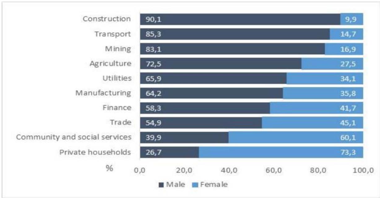 COVID-19 has had its share in the labour market dynamics globally and South Africa is not exception challenges posed by this pandemic. Furthermore, COVID-19 related labour data shows a clear pattern of gender inequality in the labour market in South Africa. Figure 1 below shows percentage distribution of those who worked during lockdown by industry and sex, Q1: 2021. As argued by Statistics South Africa (2021b) of the 15,0 million persons who were employed in Q1: 2021, almost four out of every five persons $(81,3\%)$ were expected to work during the national lockdown by the companies/organisations they work for. Reflecting the gender dynamics of the South African labour market, about 9 in 10 people employed within the Construction industry who worked during the lockdown were men. Construction activities takes place because of infrastructure investment. However, looking at figure 1 below construction sector shows to be an industry were fewer women engaged in work activities across all industries during lock-down. Worth noting, is the higher number of women in the community and social services and private household thus pointing the continuous gender role definition by society and the labour market in general.