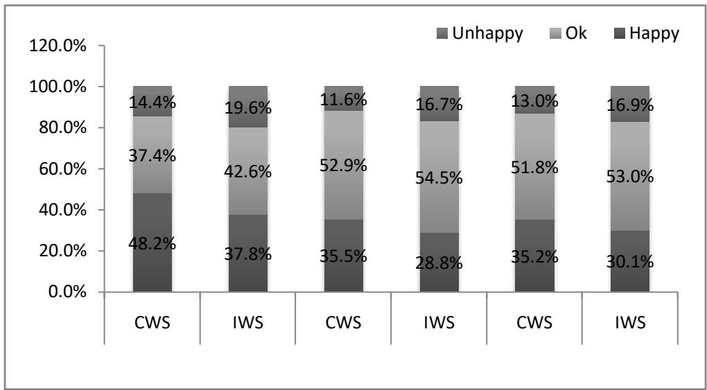 The results from household-level analysis although, they appeared to be in favor of 24x7, did pose many questions about its sustainability, which we discuss later. We collected customers' perceptions about satisfaction over the quantity of water supplied, its quality, and the pressure in the pipes supplying water. For all the three parameters, the level of satisfaction was better in CWS than in IWS wards (see Fig1). Our recent visits to 24x7 demo zones revealed that several households followed the earlier system of storing water and filled fresh water once in 3 days, reasons. These reasons are uncertainty about continuity, slow flow during peak hours, and the feeling that the rates may go high if they daily use the water. So the new system has not made any difference to some of these households. Concerning quality, there was not much difference between the opinions of customers in CWS and those in IWS as they could not make a clear distinction. A few households who used to get muddy water during the rainy season under IWS due to leakages in pipes were happy as 24x7 had put an end to it. Although 24x7 assures high pressure of around 22-40 meters (World Bank 2010) minimum, being 6 meters in pipes, it was found during the survey that those staying on the first and second floor had slow water flow in the morning hours, and could fill their overhead tanks only during noon and after that. Only $58\%$ of households have treated drinking water. We found households in IWS wards treated water compared to CWS. Moreover, we found slum households are less concerned about the treatment of drinking water than the Non-slum areas (see fig 2).