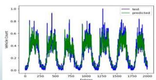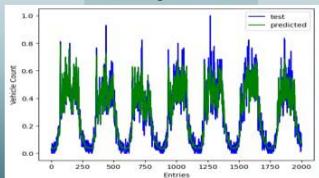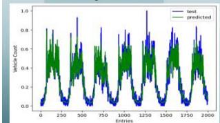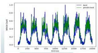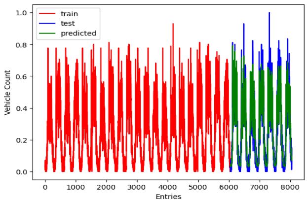 from hour to hour there can be seen significant increasements or decrements in traffic behavior. Therefore, first it was identified it is better totake 12 data points at a time to train the prediction model. Then the desired window size was kept to twelve and using data gathered over a month the very first LSTM neural network model was trained. Below figure 7 illustrates the resulted predicted traffic behavior vs test data plot and figure8 illustrates the entire plot of the trained data, test data and resulted predicted traffic data.