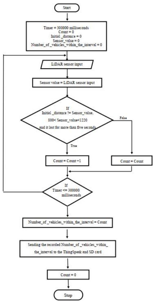 Additionally, distance measurements must persist longer than 50 milliseconds and return to zero which is the initial distance value. The presence of a vehicle will therefore be counted as present if both prerequisites are met, where the count will be one. Likewise, the vehicle count is taken and increased within a 5-minute interval. And the vehicle count is programmed to be zero after every 5 minutes (5 ×1000 × 60 milliseconds) intervals and the latest value which is recorded as the vehicle count inside that interval is to be delivered to the ThingSpeak IoT platform as well as to an SD card. Here the ThingSpeak online IoT platform was used as the source to create the database. A database was developed by recording consecutively collecting data. ESP8266 (NodeMCU) module was used as the microcontroller which can enable further improvements with IoT connecting several nodes.