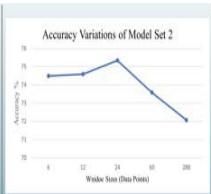 <table><tr><td>Volume of input (Data Points)</td><td>Window size (Data Points)</td><td>Accuracy %</td></tr><tr><td>8064</td><td>6</td><td>74.49</td></tr><tr><td>8064</td><td>12</td><td>74.59</td></tr><tr><td>8064</td><td>24</td><td>75.34</td></tr><tr><td>8064</td><td>60</td><td>73.58</td></tr><tr><td>8064</td><td>288</td><td>72.07</td></tr></table>