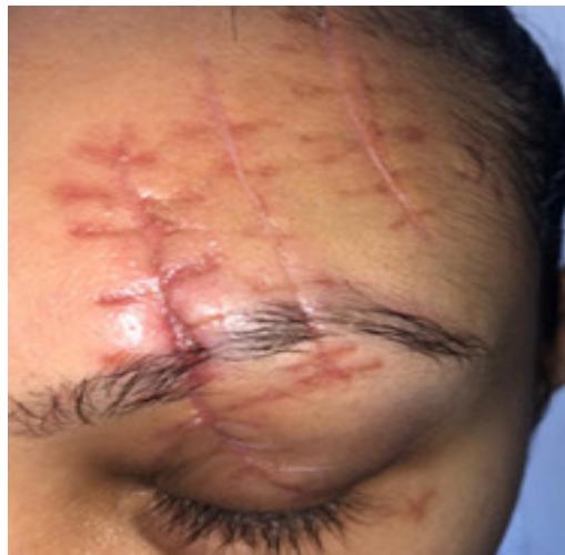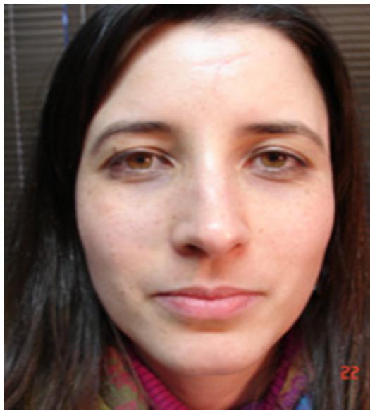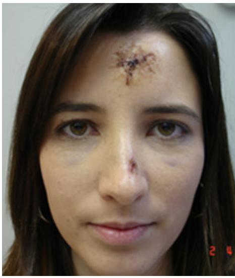 33-year-old female, fell from the stairs and hit a glass door. She came to the Clinic 3 weeks after the accident. At that time she presented scars on the left frontal region and upper left eyelid, as well as scar retraction with enlargement of the scar near the glabellar region. The patient had some muscle movement in the affected area.