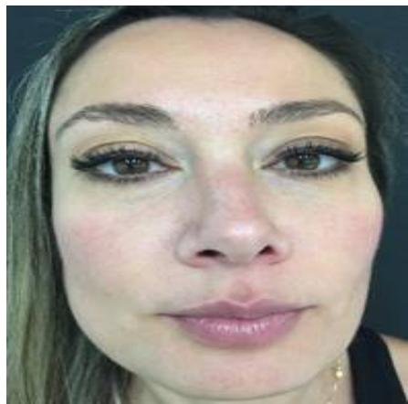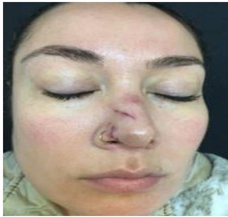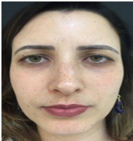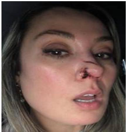 30-year-old female, was attacked by a dog that bit her nose. The patient was seen at the clinic 48 hours after the attack. Botulinum toxin A was applied to all nasal musculature (4ui per puncture in this area). The treatment was repeated after 3 months.