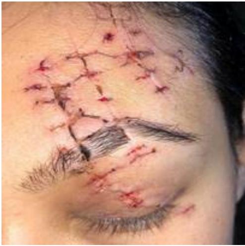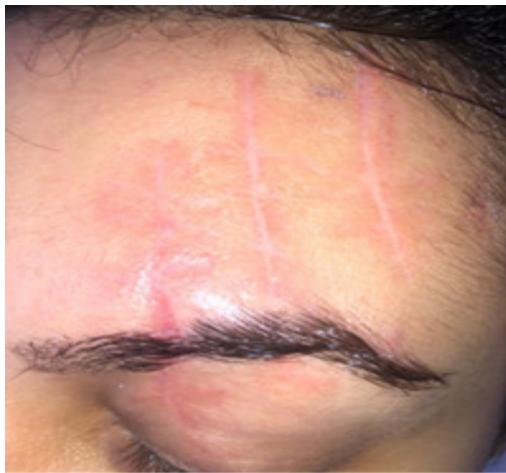 30-year-old female, had an accident riding a bicycle. She injured her forehead and was treated in the emergency room. On the following day, she went to the clinic concerned with the aesthetic effect of the injury.