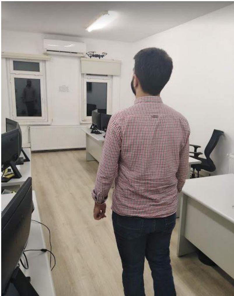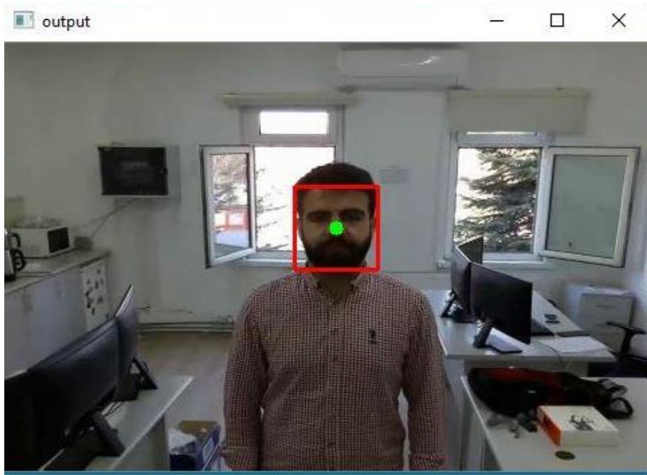 İnsan yüz tespit ilele uygulandiktan sonra, tespit edilen insan yüzün nıgcik zamanlı olarak yer degişimlerin takip edilmesi ilemiGeorgekleşirilmistir. Takip ileminin yapildigi kapalı ortam ve takip ileminGeorgekleştiğini gösten,göruntü Şekil 7'de sunuldugu gibidir.