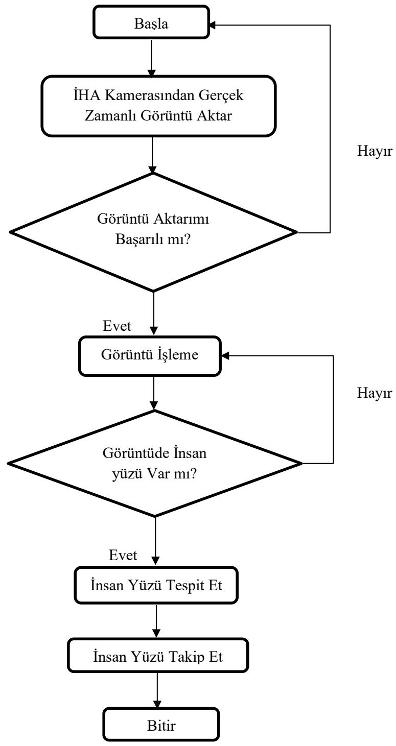 Bu calismada görtü istleme teknojisini kullanabilmek icin OPENCV kutuphanesinden yararlanilmşir. Bu baglamda insan yüz tespiti islemi icin OPENCV kutuphanesinin icerisinde barindirdigi birçok algoitmadan birisi olan Haar-Cascade sinflandircisi kullanilmşir. Sinflandirci, doğruluk oranın yüksek olması ve kolay uygulanabilir olmasindan dolayı tercih edilmşir [26]. Haar-Cascade sinflandircisinözellikleri kullanilarak iHA'nin kamasindan alinan görtütdeki insan yüzün ntespit islemi ve sinflandirma islemi yapilmşir. Tespit islemi sonrasinda iHA'nin camera kadrajina giren insan yüzün nkan camera kadrajindan Çikanaka kadar ki surendeGPCEK zamanl olarak takip islemiGPCKleştilirmşir. Uygulamaya ait akı semasi Sekil 1'de, calismada kullananan IHA isecikil 2'de sunulmştur.