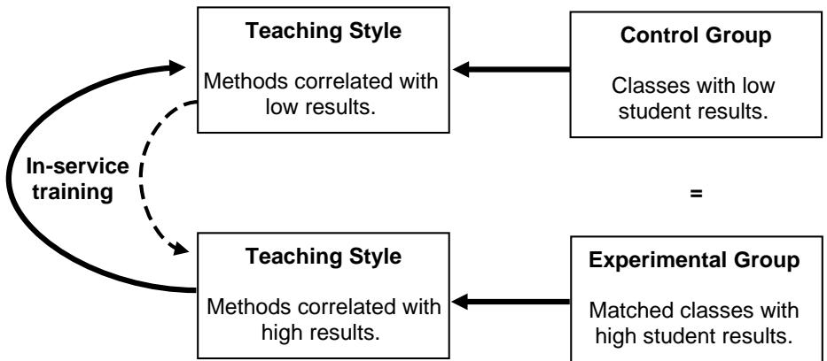 Research Design: The starting point for reverse engineering is student learning. The next step is to work backwards to identify which teaching practices correlate positively with student learning in a particular context. This knowledge can then help generate culturally-informed in-service and curriculum development. A research design for field experiments in Figure 2 conceptualizes separating classes into high- and low-achieving ones to establish which teacher practices are associated with high student outcomes compared to other teachers with similar resources but low outcomes. A control group of classes is identified with low learning results, for example classes where mean results are in the lowest quartile on high stakes public exams. An experimental group is identified with mean results in the top quartile. The two groups are otherwise matched as much as possible on other variables (e.g., school location, student socio-economic status, teacher qualifications and experience).