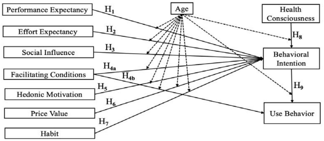 However, regarding the moderating effects of user age, the findings show clearly, the relationship between HT and BI was stronger for participants of the younger age group. Since HT was a significant factor affecting a younger adult's intention to use WFTs, practitioners should put their endeavor on strengthening the habitual use of the product by proactively reinforcing the relationship with consumers. For example, companies might focus the personalized benefits and promote features that could assist in managing personal health. Customers and marketers, governments, insurance companies and the healthcare industry have great implications through the usage of WFT. As this research identified hedonic motivation, performance expectancy, and facilitating condition to be significant factors in behavioral intention to use WFTs, we recommend that to retain consumers, providers should design these technologies in a new-fashioned way for the end users to enhance enjoyment and engagement with WFTs. The recommendations can be used as new research model to foster the adoption intention of WFTs among users.