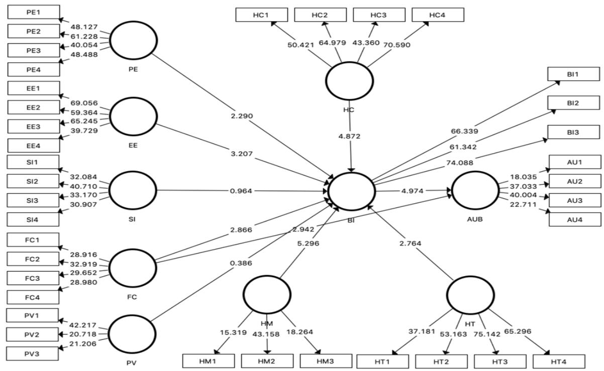<table><tr><td>Hypotheses</td><td>Relationships</td><td>Std Beta</td><td>Std Error</td><td>T-value</td><td>P Values</td><td>Comments</td></tr><tr><td>H1</td><td>PE -> BI</td><td>0.149</td><td>0.065</td><td>2.290</td><td>0.022</td><td>Supported</td></tr><tr><td>H2</td><td>EE -> BI</td><td>0.168</td><td>0.054</td><td>3.207</td><td>0.001</td><td>Supported</td></tr><tr><td>H3</td><td>SI -> BI</td><td>0.036</td><td>0.037</td><td>0.964</td><td>0.335</td><td>Not Supported</td></tr><tr><td>H4a</td><td>FC -> BI</td><td>0.183</td><td>0.064</td><td>2.866</td><td>0.004</td><td>Supported</td></tr><tr><td>H4b</td><td>FC -> AUB</td><td>0.226</td><td>0.076</td><td>2.942</td><td>0.003</td><td>Supported</td></tr><tr><td>H5</td><td>HM -> BI</td><td>0.224</td><td>0.042</td><td>5.296</td><td>0.000</td><td>Supported</td></tr><tr><td>H6</td><td>PV -> BI</td><td>-0.010</td><td>0.042</td><td>0.386</td><td>0.700</td><td>Not Supported</td></tr><tr><td>H7</td><td>HT -> BI</td><td>0.169</td><td>0.061</td><td>2.764</td><td>0.006</td><td>Supported</td></tr><tr><td>H8</td><td>HC -> BI</td><td>0.236</td><td>0.048</td><td>4.872</td><td>0.000</td><td>Supported</td></tr><tr><td>H9</td><td>BI -> AUB</td><td>0.379</td><td>0.076</td><td>4.974</td><td>0.000</td><td>Supported</td></tr></table>