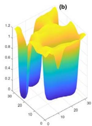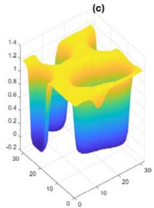Fig. 4: Learning and pattern recovery of the field solution that integrates machine learning with physics models. (a) Mesoscopic pattern with added noise (b) Original mesoscopic pattern (c) Recovered mesoscopic pattern from field solution that integrates machine learning with physics models; two samples are used to infer the interacting parameter