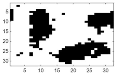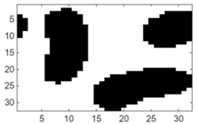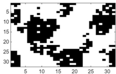 Fig. 2: Restricted Boltzmann machine learning and pattern recovery. (a) Original mesoscopic pattern. (b) Mesoscopic pattern with added noise (c) Recovery of original pattern for a restricted Boltzmann machine trained with 80 samples of the same statistics (d) Recovered pattern for a restricted Boltzmann machine trained with 10 samples of the same statistics For the field solution that integrates machine learning with physics models, we first construct a machine learning neural operator that maps between auxiliary fields (or connection weights) and mesoscopic fields (visible nodes). Figure 3 provides two examples comparing the neural operator predicted mappings with