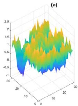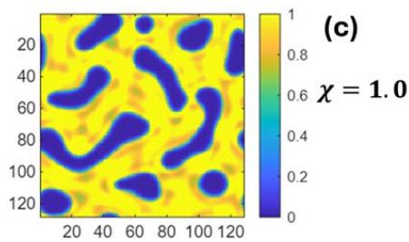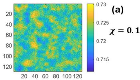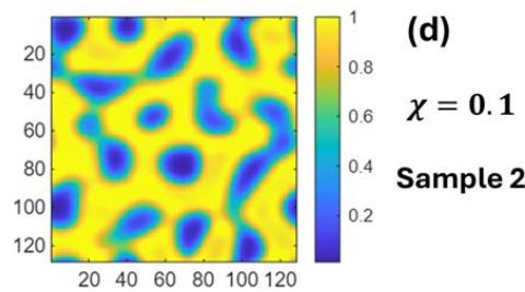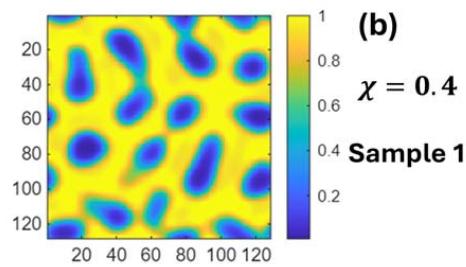 We generate mesoscopic patterns by sampling the system with action functional (25) on a two-dimensional domain. The spatial lattice spacing is 0.2 and the normalized (via lattice spacing) microscopic interacting parameters are $k_{A} = k_{B} = 2.25$. The chain length is 100 with $N_{A} = 70$ and $N_{B} = 30$. $n$ is chosen to normalize density $\rho_0 = 1$. Figures 1a, 1b, and 1c show examples of mesoscopic density $\rho_A$ for different interacting parameters $\chi$. Figures 1c and 1d show two different statistical mesoscopic sample patterns for the same interacting parameter $\chi = 0.4$. The density $\rho_B$ is a complementary of $\rho_A$ due to conserved local density.