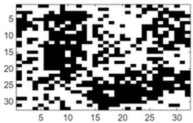 In traditional Boltzmann machine learning, connection weights between visible and hidden nodes must be trained on large, statistically similar samples. Figure 2a displays the original mesoscopic pattern generated from two interacting species, while Figure 2b shows a noisy version. Recovering the original pattern requires training with many statistical samples; Figure 2c illustrates a successful recovery using 80 training samples with the same statistics. In contrast, Figure 2d demonstrates that a restricted Boltzmann machine trained with only 10 samples cannot effectively restore the original pattern from noisy data.