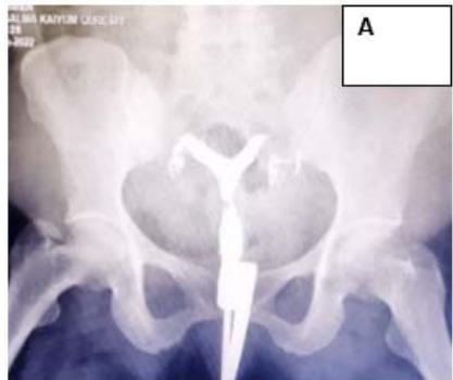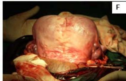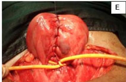 Figure 4: A: HSG s/o Bicornuate uterus. B: Bicornuate uterus. C: Temporary ligation with Foley and opening uterine cavity. D and E: Anterior and posterior surface after suturing. F: Healed uterus as seen during Caesarean section.