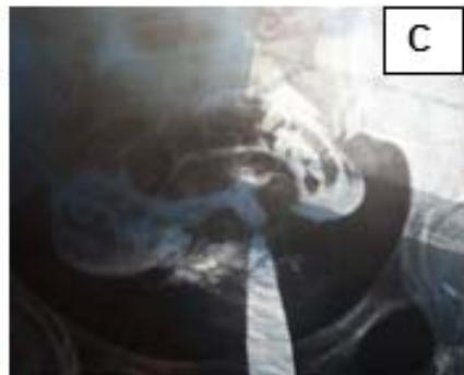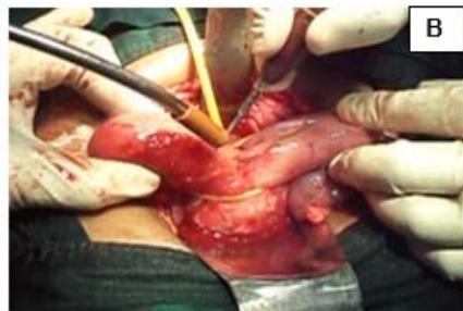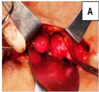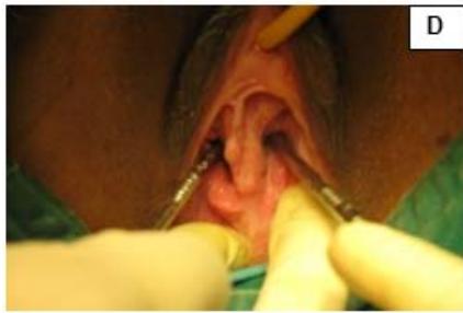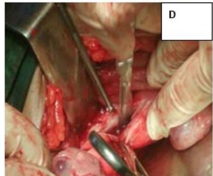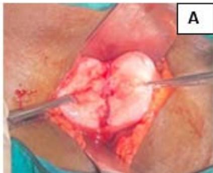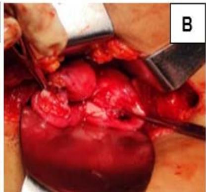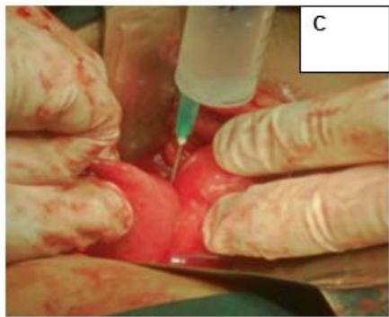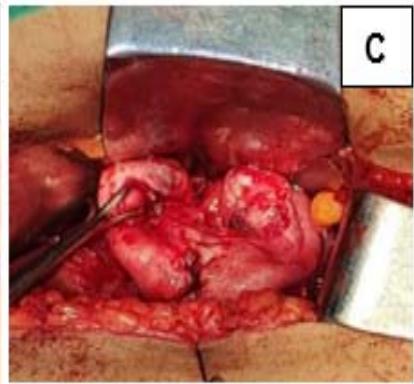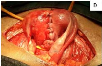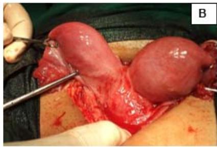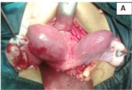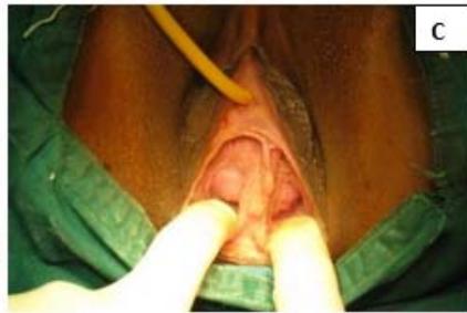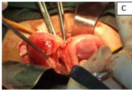Figure 1: A: Uterine didelphys. B: Cavity opened. C: Edges of cavity approximated and sutured.