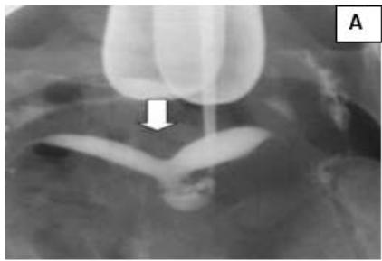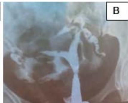 A 35-year-old, female married for 8 years, with a spontaneous abortion at $4^{\text{th}}$ month of gestation, presented with Secondary infertility. USG showed bicornuate uterus with almost equal right and left horns, communicating in the lower third of the uterus, s/o Bicornuate uterus. ESHRE Class: U3a. HSG confirmed the same. Follow up- HSG post metroplasty showed resolution with slight depression in the fundal region. (Fig. 3)
