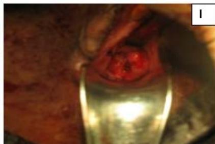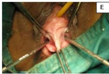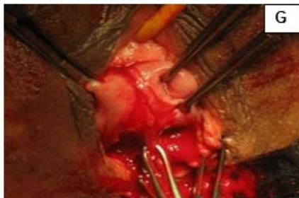 Figure 5: A: Uterine didelphys. B: Opening cavity during metroplasty. C: Complete vertical septum infiltrated with saline. D: Vaginal canals opening into two separate cervical openings. E: Anterior lip of cervices held with Allis' forceps and vertical incision taken over septum. F: Plane of dissection maintained along the septum. G: Redundant mucosa cut. H: Cut ends sutured with vagina with Vicryl 3-0. I: Vagina with two cervices.