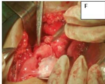 Figure 2: A: HSG s/o Bicornuate uterus. B: Bicornuate uterus on laparotomy. C: Vasopressin injected to minimize the blood loss during surgery. D: Transverse incision taken over uterine fundus. E: Uterine cavity opened. F: Edges approximated & sutured vertically