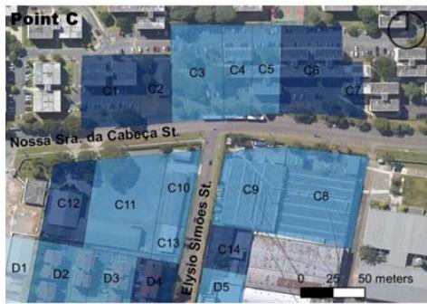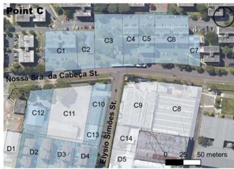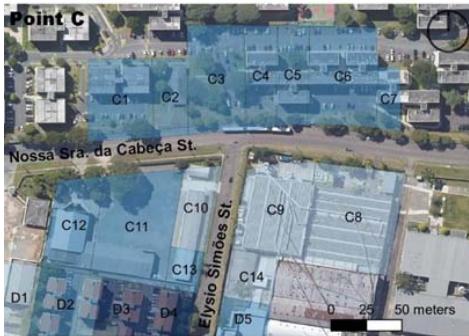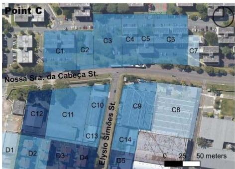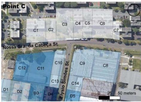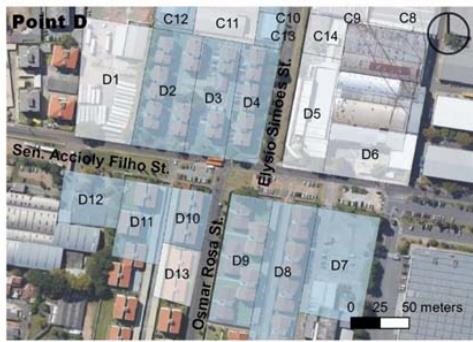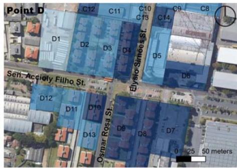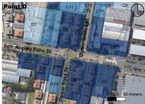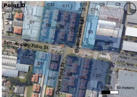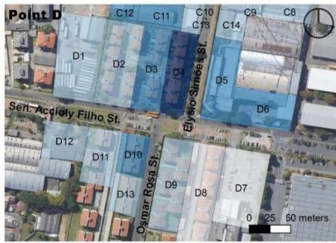 Considering that smaller block size generates more perpendicular routes, offering greater flow possibilities, this item was categorized by main lengths (Table 4) in the study section, demonstrating that different land use and occupation types generate results in the urban fabric. The industrial pattern, with large lots and little feed into the road network therefore brings lower ratings to points C and D than to A and B, suggesting the latter to have more excellent pedestrian circulation, even if it is only passing through. According