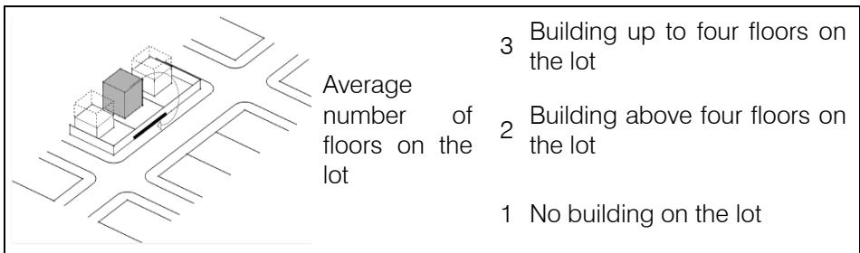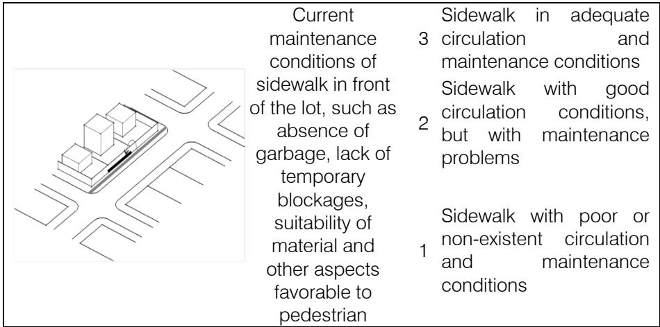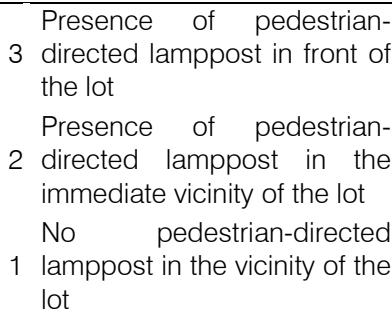 <table><tr><td rowspan="3">Presence of furniture elements, such as banks,emptizers,buses stops and others, in front of the lot</td><td>3</td><td>Presence of more than one type of furniture in front of the lot</td></tr><tr><td>2</td><td>Presence of one type of furniture in front of the lot</td></tr><tr><td>1</td><td>No element of urban furniture in front of the lot</td></tr></table>