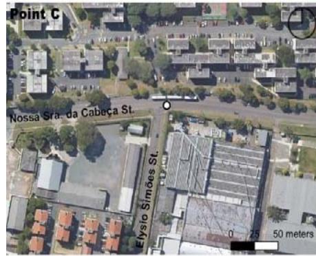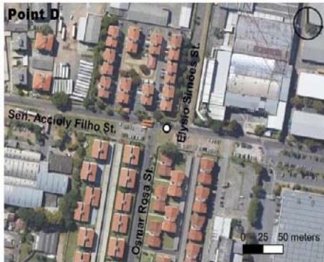 Point C (robbery leaving school in the afternoon) (Figure 6) has a strong residential character, especially in the condominium form, together with industrial use, with vegetation in different strata. In turn, the surrounding landscape of D (theft inside a vehicle during the early morning hours) (Figure 7) is composed of housing buildings of up to four floors, with a dominant presence of extensive walls.