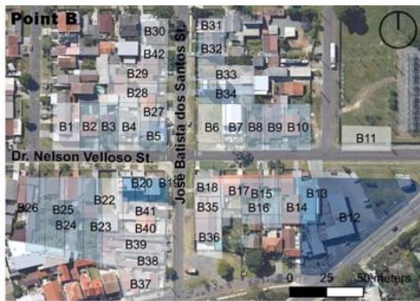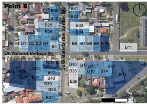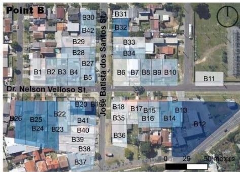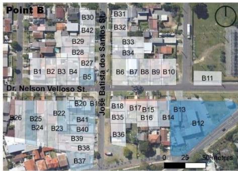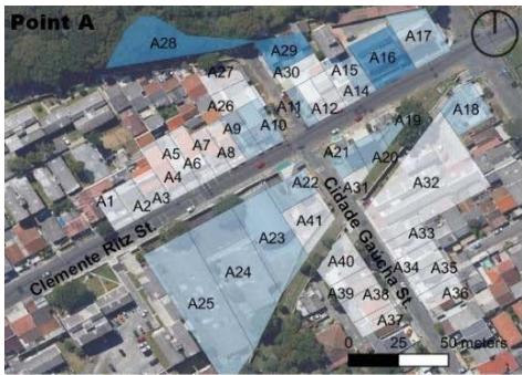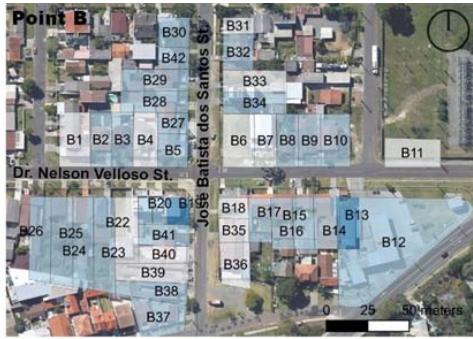 Sidewalk size (Table 5) refers to its width for free and comfortable movement of pedestrians, with an ideal initial parameter of more than $2.00\mathrm{m}$, along the frontage of the unit of analysis. In addition to having no path paving, none of the lots at points A and B are rated at maximum, revealing significant obstacles to universal accessibility (Müller et al., 2023).