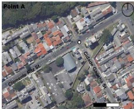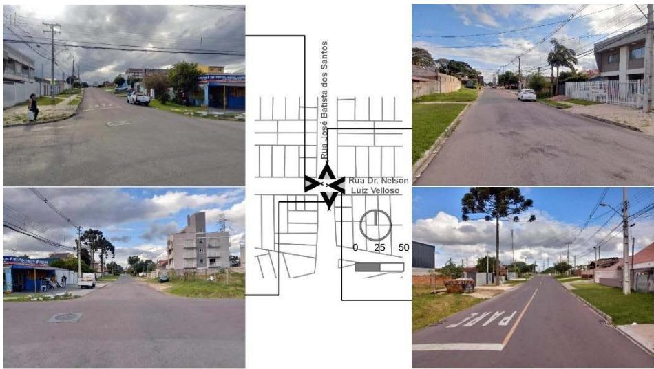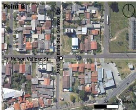 Legend Crime location Source: Based on field surveys, Google Earth (2023) and OFR (2018) In terms of the four selected points, different characteristics are noted for the surroundings of A (armed robbery at night) and B (vehicle theft at night) (Figures 4 and 5), whose urban fabric is more homogeneous and continuous, with many street intersections due to collective industrial and residential uses, producing fewer street intersections.