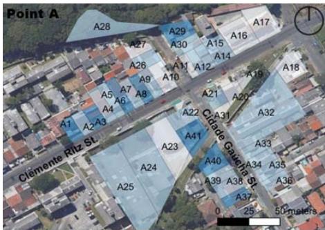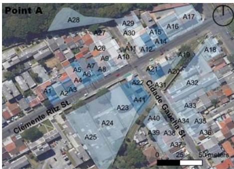 Evaluation of surveillance systems (Table 27) considered structures or remote monitoring equipment, which indicate the presence of possible local control and also discourage potential offenders, fostering a sense of protection for users. All points have some such infrastructure for at least one unit of analysis, as at A and B.