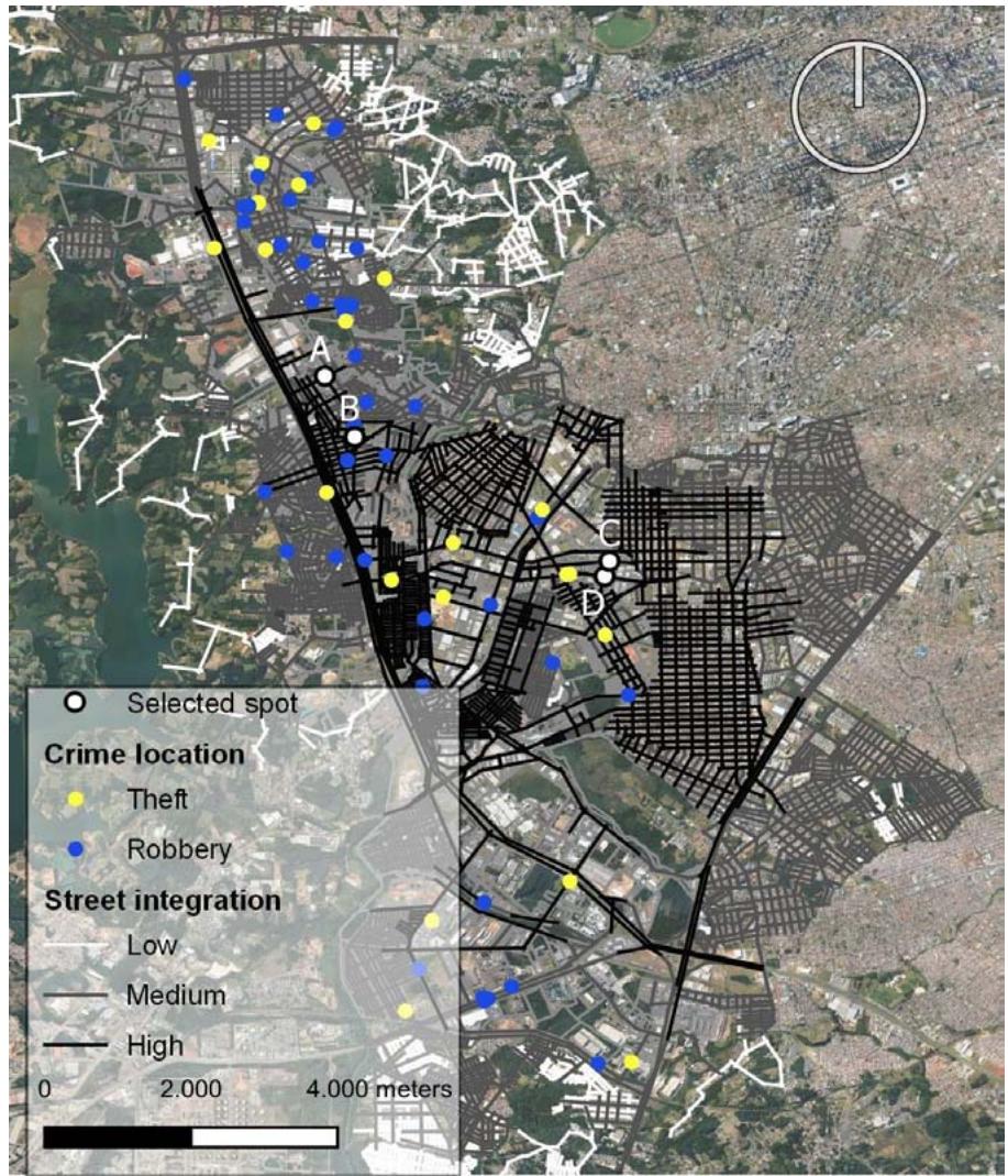 Evaluation of street integration information and crime-spot location together, represented in Figure 3, resulted in selection of four places of interest, which have both high levels of integration and at least one incidence of crime.