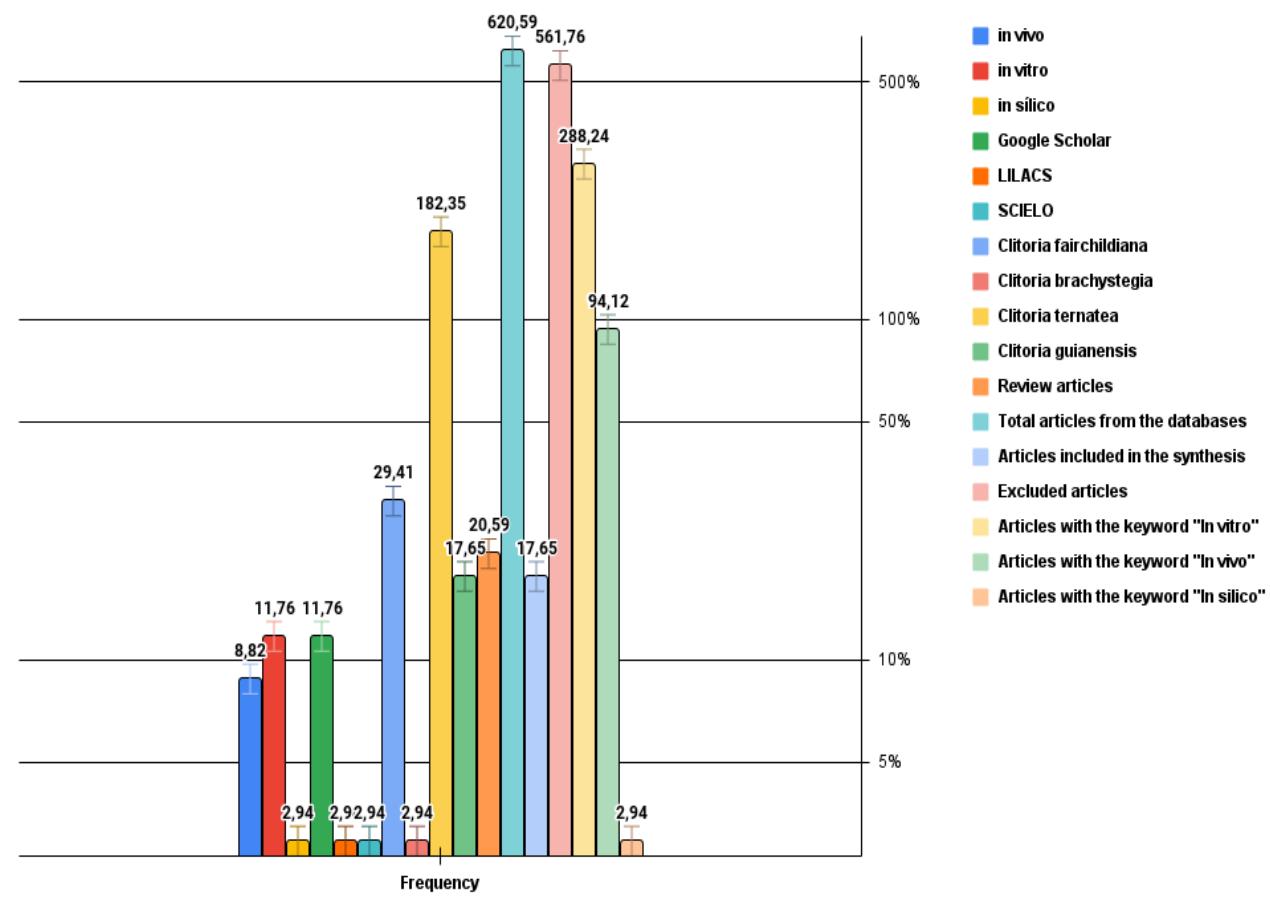 Observing the studies, the relevance of in vitro research is evident, representing $288.24\%$, with no cell studies, only one microbiological study with fungus. This indicates a significant emphasis on this modality, reflecting the growing importance of Clitoria guianensis in scientific investigations for other tests.