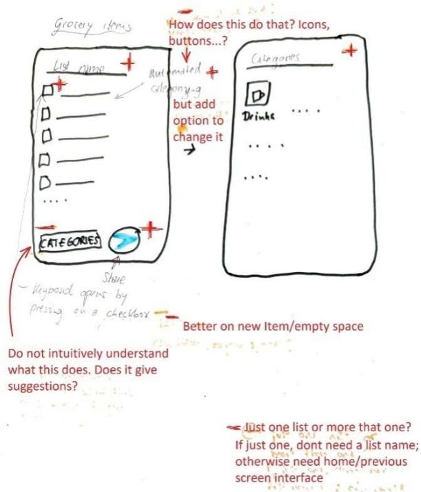 The work samples from P2 did not match the instructed pattern and thus was difficult determining points of consensus under the application of the principles of the R-verdict schema. It was however possible to analyse assessment by both parties independently. Obviously, P2 listed more functional features that UI components for usage context. Consequently, P2 focused more attention of organising UI components made available to participants, thus running into an obvious case of "feature creep" (Pringle, 2017). It is however evident that, P2 was able to self only two of his listed components/features (Product list and checkbox) were directly related to the usage context (see table 1.3).