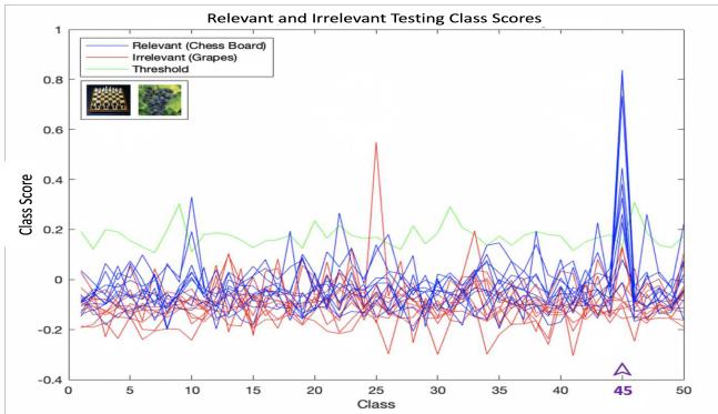 Within Figure 5 we present an example where class score values for ten testing images from two classes are plotted. During the training of the classifier matrix we treated the Chess Board pictures as labeled (Relevant), with label 45 attributed to them, and the Grapes pictures as unlabeled (Irrelevant). On the graph we can see that during testing, most of the Chess Board pictures have high class score values on the correct class (45). The correct scores are also above the $T_{S}$ of this class, therefore they will be classified correctly as members of the chess board class.