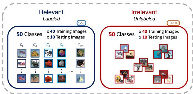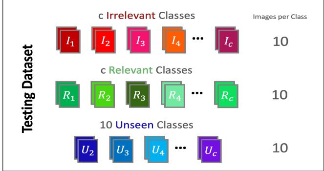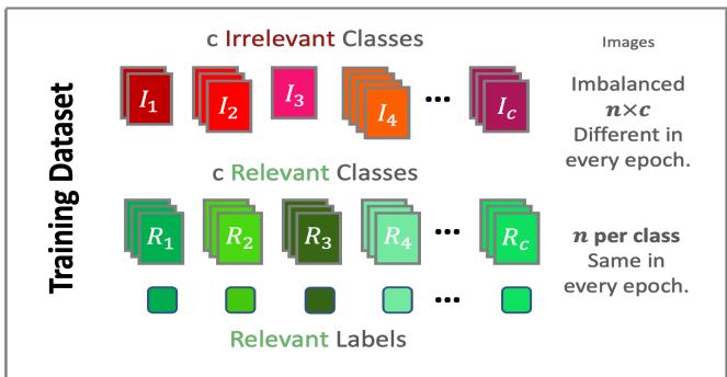 Figure 9: The two differences of the OSLS method compared to the Low-Shot Classifier: We extend our testing dataset to include 10 classes of unseen images (each containing 10 testing samples) while also extending the irrelevant part of the training dataset by introducing randomness and imbalance between epochs and classes respectively. During training, a different selection of irrelevant samples and the same selection of relevant samples is used in every epoch.