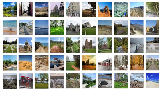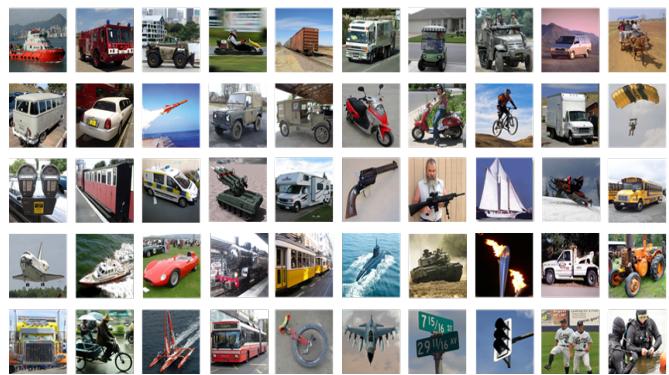 Figure 4: Example images from each one of the 100 classes that comprise the mixed dataset. The 50 relevant images include a variety of different vehicles, humans and weapons while the 50 irrelevant include buildings and outdoor scenery.