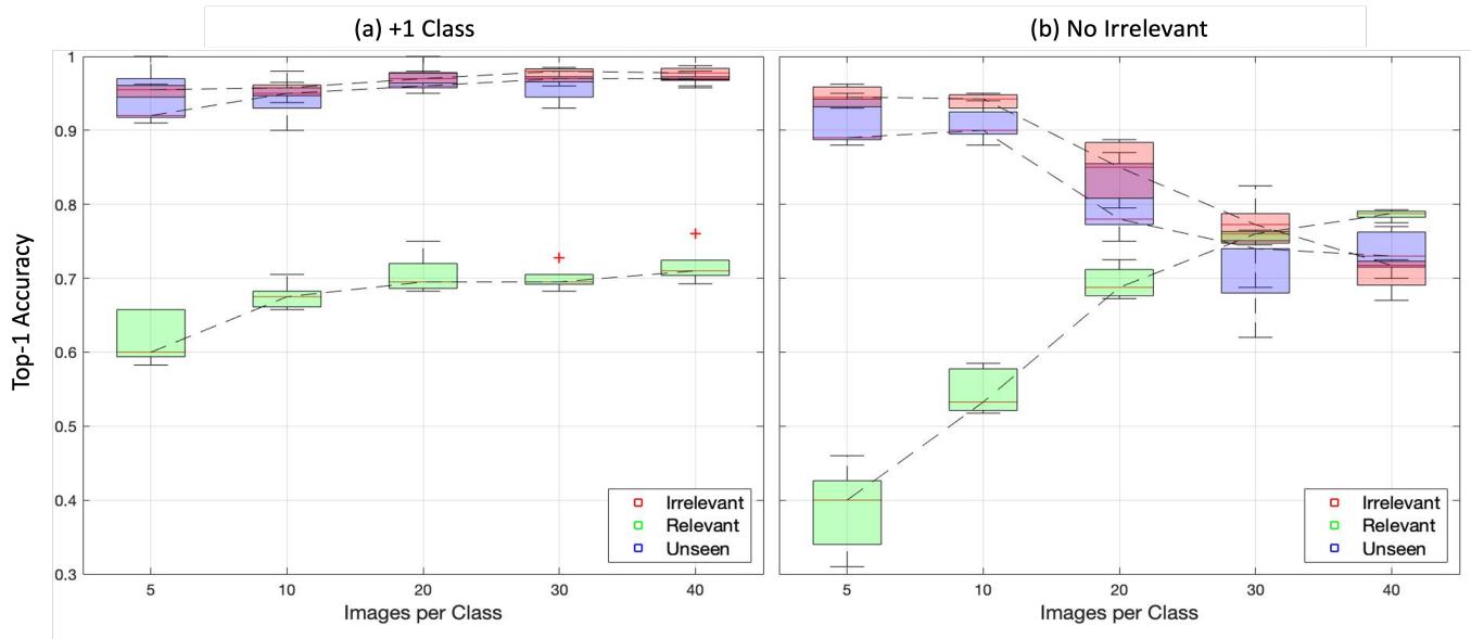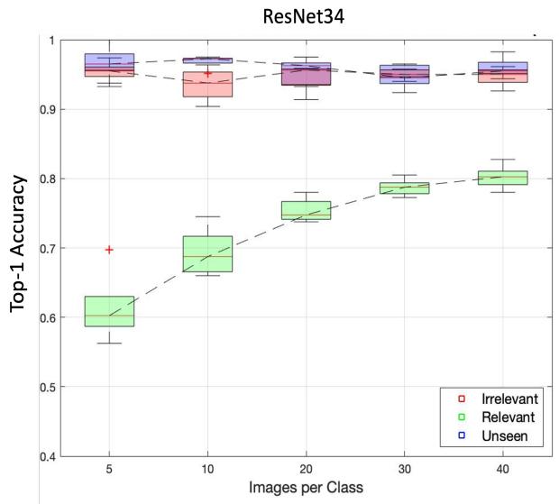 Figure 10: The accuracy box plots for the three different testing groups are presented: in red the Irrelevant, in blue the Unseen and in green the Relevant results. For every Images per Class case, ten different random tests are performed in order to quantify the uncertainty of each case study. The box plot sides represent the median of the lower and upper half of the different results set respectively. The lines extending from the boxes (whiskers) indicate the variability outside the upper and lower quartiles while the red line within the boxes represents the median of the entire spread. Lastly, the red crosses represent the accuracy of the outlier runs and the dashed line connects the median accuracy values of all the different cases.