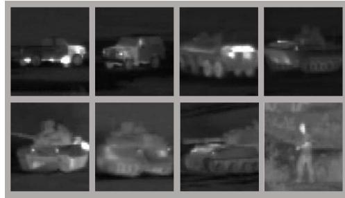 Figure 3: The manually created infrared (IR) dataset using video snapshots from the ATR database consists of eight classes, seven of them are civilian and combat vehicles and the last one is a human class.