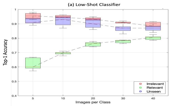 classifier on 10 Relevant and 10 Irrelevant classes each one 10 of which includes 40 training samples- a total of 400 labeled and 400 unlabeled images. By testing using 10 samples per class from 10 relevant, 10 irrelevant and 10 unseen classes the classifier achieves Top-1 accuracy scores of $0.89 \pm 0.04$, $0.98 \pm 0.02$ and $0.96 \pm 0.02$ respectively, with a very low variance between the random runs ( $f \leq 0.04$ ).