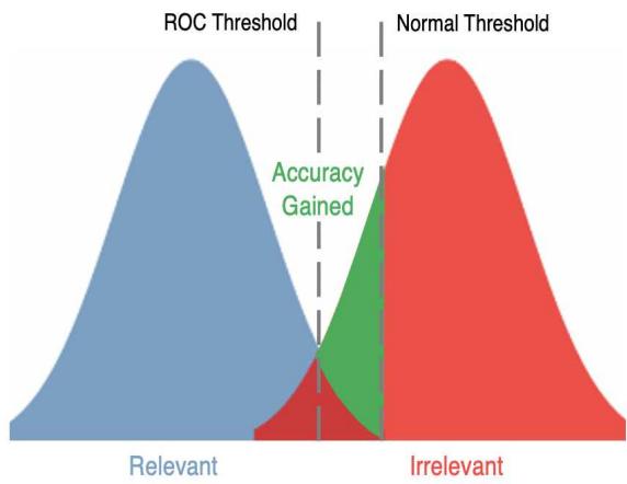 To maximize the combined accuracy we use the ROC curve [27, 13, 12] to chose our threshold values. The same Way we would do with a Normal Threshold, the ROC Threshold is going to be calculated right after training and before testing, using explicitly the training data.