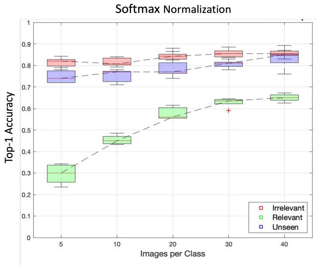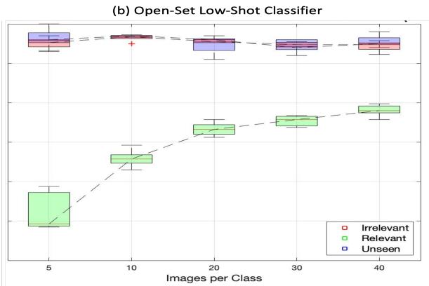 All the results presented in the box plots of this text are for an OSLS classifier that is trained on 40 relevant and 40 irrelevant classes, both of which have the amount of relevant images per class specified in the x-axis. Similar works in the open-set literature [10, 7, 25] are using a lower number of classes during training and testing (10 to 95 classes compared to the total number of classes used in this paper ranging between 90 and 250). To show how the OSLS Classifier performs in tests where the same order of classes are used, we vary the number of relevant and irrelevant classes used during training. Although it is of interest to recognize samples of as many classes as possible (a maximum of 40 as presented in Figure 10), by observing Table 4 it is evident that the OSLS Classifier achieves very high Top-1 accuracy scores in situations where the relevant and irrelevant classes we are trying to detect are limited.