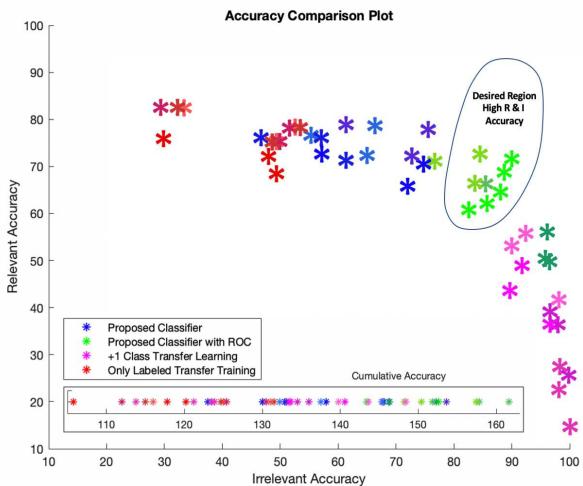 Figure 10 demonstrates that by introducing randomness and class imbalance during training, for every Images per Class case there is a slight decrease in the relevant accuracy, but a substantial increase in the testing performance of both irrelevant and unseen. All the results below use the ROC threshold that produces the highest combined relevant and irrelevant score.