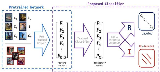 To explore the open-set low-shot problem in a holistic, non-specific and easily applicable way, we concentrate only on the training of the classification matrix (matrix used to turn the feature vector to a probability vector in Figure 1), using the pre-trained ResNet feature extractors [15] discussed in Section 2. We reduce the image matrices to feature vectors [8, 1] which are then used in Section 4 to train the classifier with the help of the analytic derivative of our loss function and a unique, partially labeled, target matrix. In Section 5, we use the classification variability statistics and a Receiver Operating Characteristic (ROC) curve as a method to calculate threshold scores for each relevant class. An approach that uses random selections of unlabeled irrelevant images during each epoch of the classifier training is introduced. Testing datasets are used in Section 3 for determining the ability to effectively classify all Relevant, Irrelevant and Unseen datasets. In the last Section we make some closing remarks on our work presented in this paper.