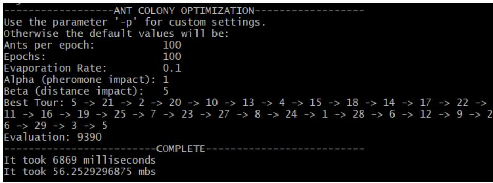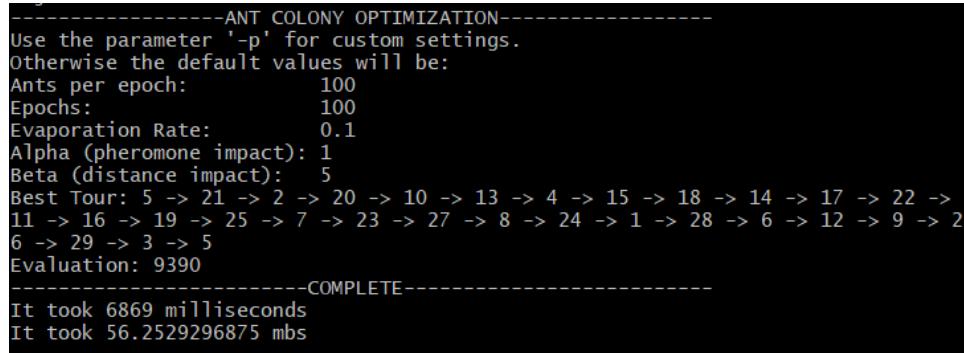 On the other hand, the ACO implementation of the same dataset generates a distance between the ranges of 9390 to 9612. These values were found by using a java program that takes a fixed dataset and calculates the shortest path. The program is fairly basic and has no option to process image files. It had been slightly modified to give time and memory cost as parts of the result. The original code can be found in the following link: https://github.com/LazoCoder/Ant-Colony-Optimization-for-the-Traveling-Salesman-Problem [6].