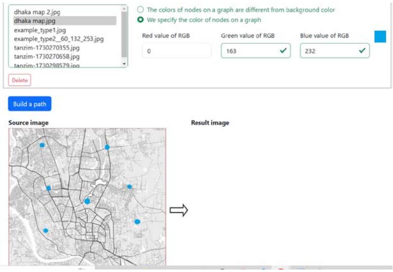 The users can select a map from the stored files and specify how nodes would be detected on the image. If a user selects the option to specify the colour of the nodes, three additional input boxes would appear. They would take the RGB value of the colour the nodes are expected to represent. Once that is specified, clicking on the button "Build a path" would activate the algorithm and generate an optimal route through the nodes.